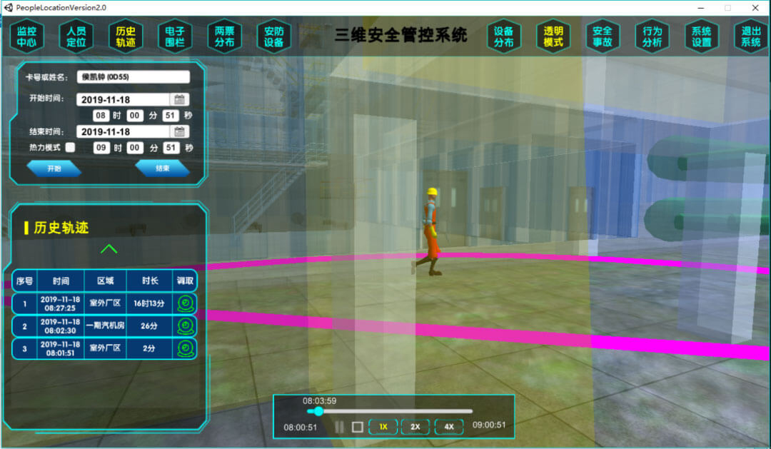 通過(guò)單人、多人以及熱力圖模式對(duì)歷史軌跡進(jìn)行查詢。多維度數(shù)據(jù)及查看方式方便變電站管理人員對(duì)位置歷史數(shù)據(jù)進(jìn)行有效分析和利用。