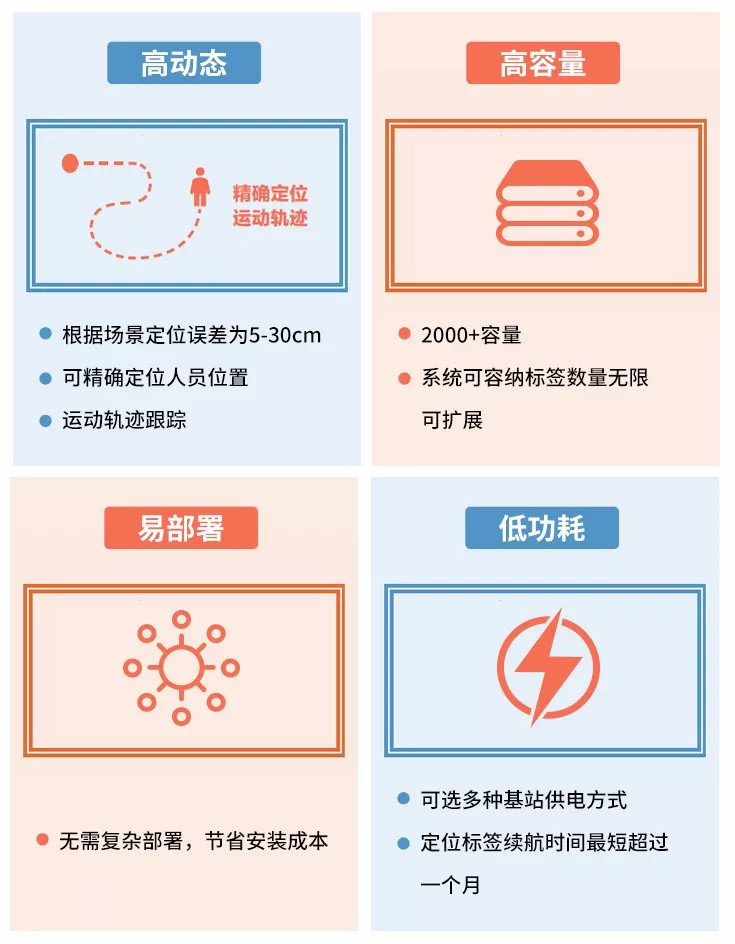 在眾多定位技術中,UWB技術具有傳輸速率高,發射功率低,傳統能力強等特點,無論是從定位精度、實時性,還是穩定性、容量大小等方面,UWB技術都完美的符合工業安全對定位技術的需求。工業場景的安全定位服務,主要針對的是人員與設備,相比其他技術,UWB更加適用。